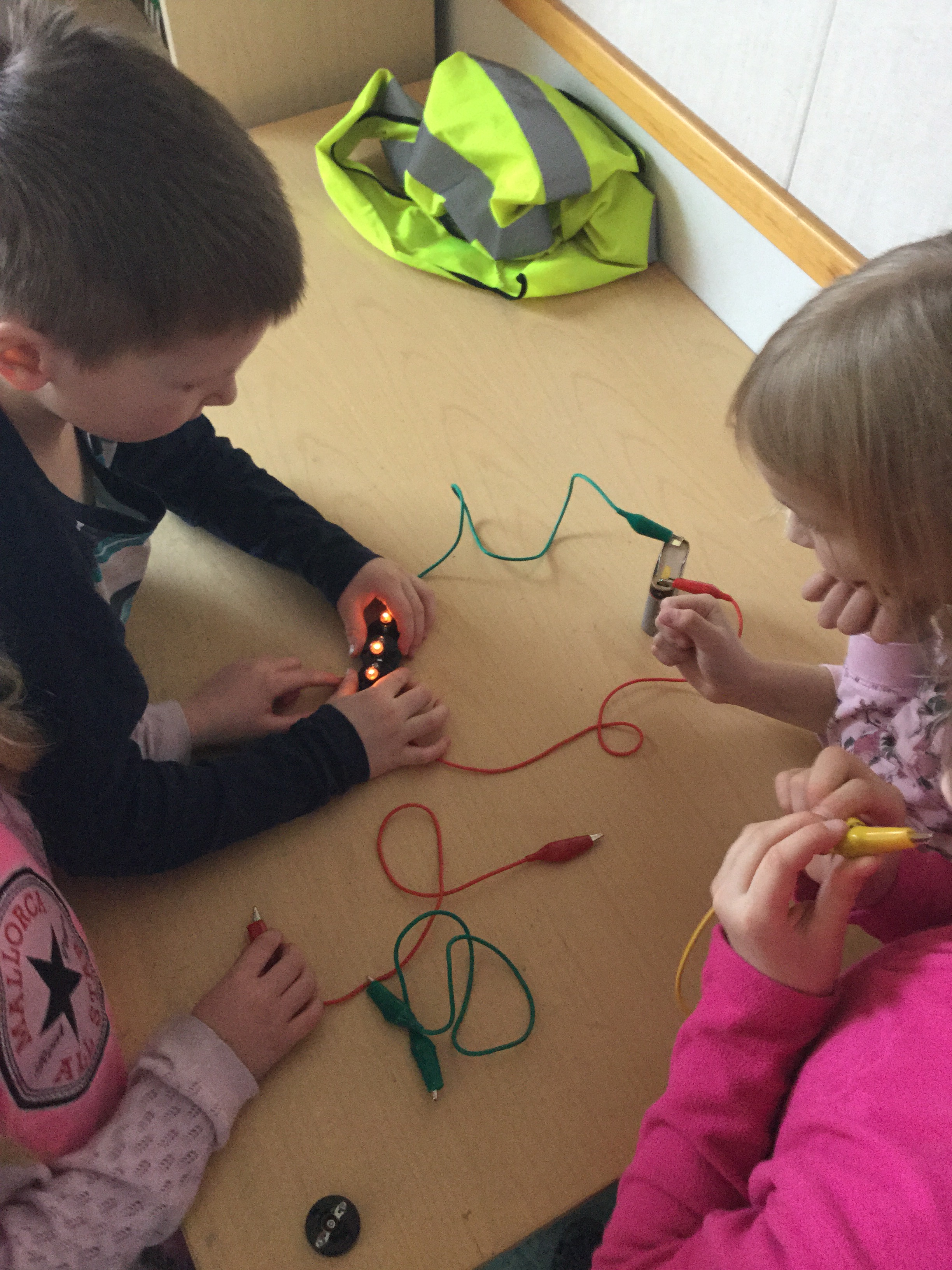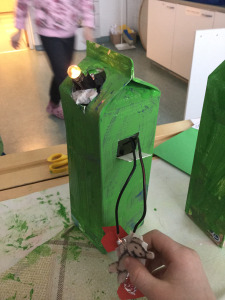 After studying we applied the things we’ve learned into real life by making cool gadgets as “the answering light” or “space”. The answering light is very useful in the classroom because by using it, students won’t have to raise their hands anymore. (According to the professional opinion of a 1st grader.) One just switches on the light that stands on her desk and the teacher sees it. In this particular gadget, the switch actually consists of two parts: a teddy-bear and a car. When the teddy is placed on the car , the light lights up! See the picture below.