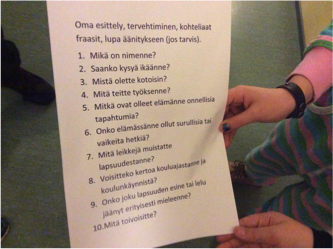 We started on working on our drama lessons by thinking somebody’s circle of life. What could have happened in person’s life when she/he was a child, a young person, an adult, an old person? Afterwards pupils made up 10 questions they would ask when we visited Old People’s Home.