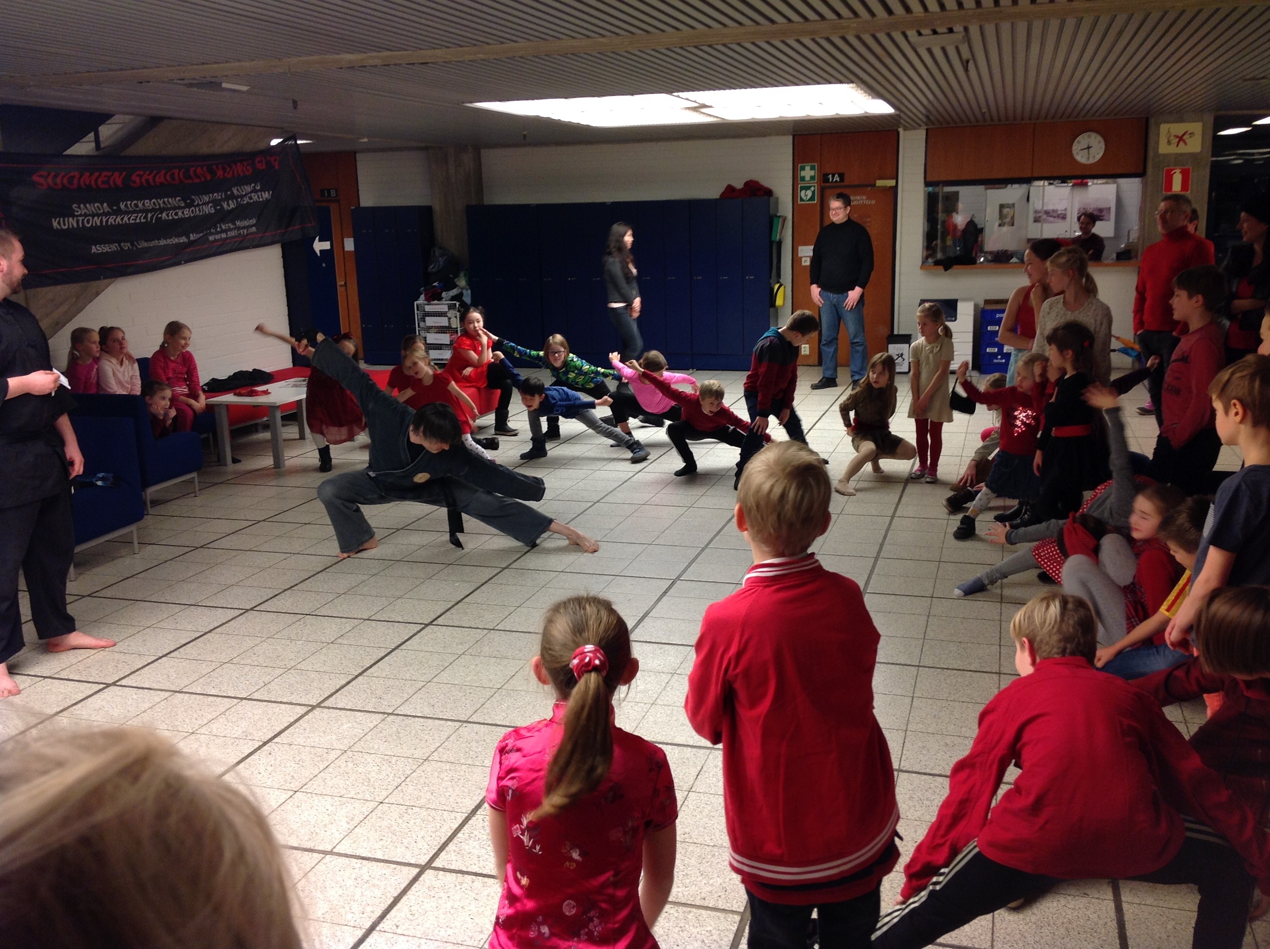 At my classroom students gave their performances to parents. We also did Eye protection rehersals all together; we learned this from Aleena last year. Then we had a visitor from Confucius Institute University of Helsinki, Mr. Xinsheng Li gave us a short lecture about Chinese calligraphy. Our last visitors gave us a kungfu-show – for me it was a bit scary, but my students really enjoyed the show. What an evening we had! Have a good rooster’s year!
