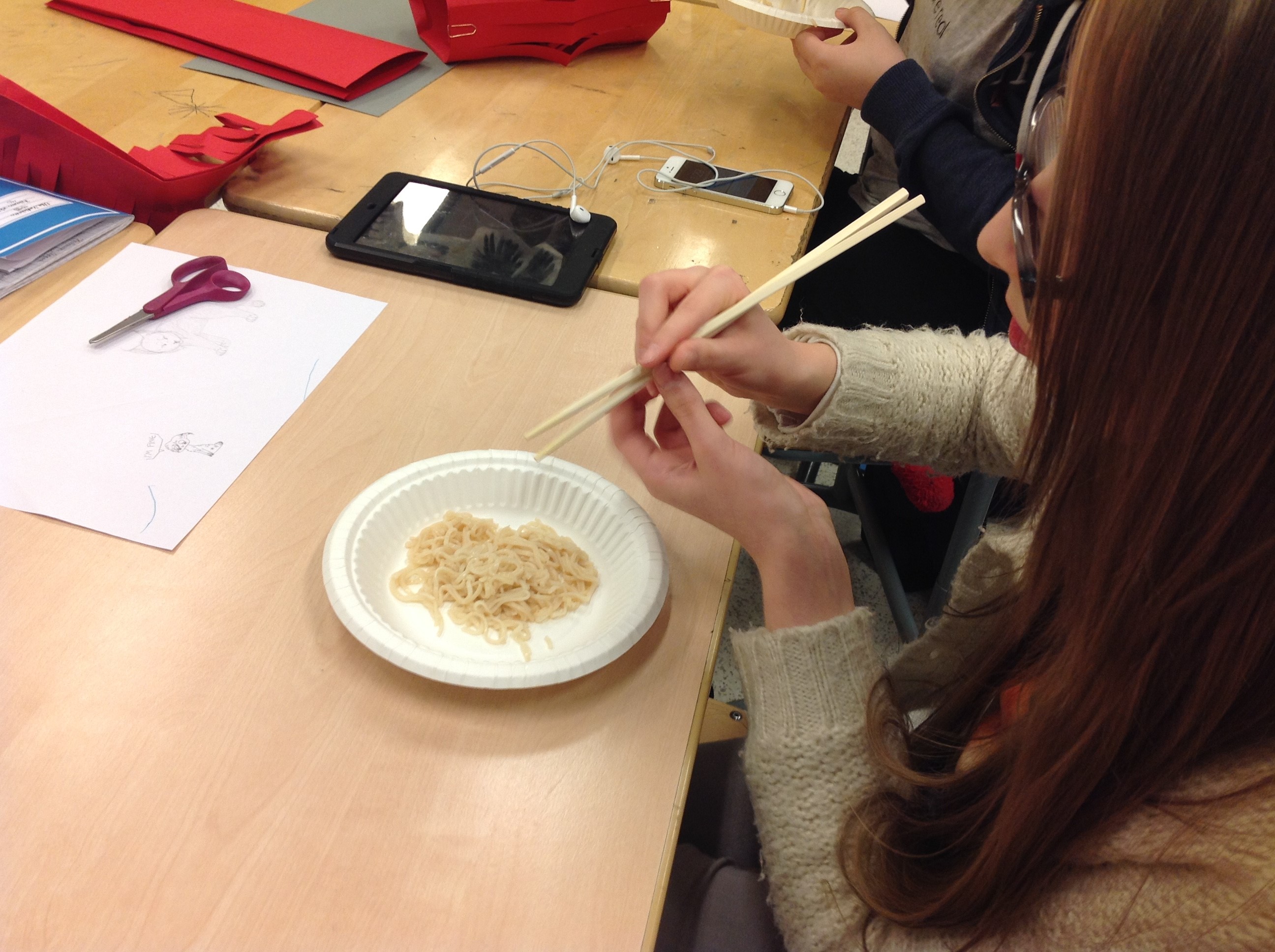 As we have worked with a Chinese school and my students have written a blog about KaiKai’s and XinXin’s visits – dolls we got last year as a present from Zhongguancun nro 4 primary school – my students’ parents decided to organize our own Chinese New Year party. The evening was a real success! First we had Chinese meal and green tea. One mother even made real, traditional New Year’s dumblings to us. Of course we ate with chopstics!